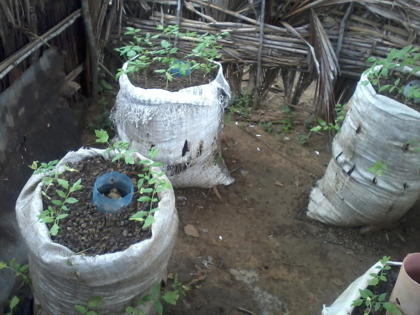 Its because of these reasons that i thought of introducing the aspect of sack gardening to the Gandini community. It happens to be one of the worst poverty hit areas. Notwithstanding is the fact that the area is adjacent to Moi International Airport. While taking off from the airport,its the area you mostly see with mud-walled makuti houses. I chose sack-gardening bearing in mind that the area gets quite dry and water scarcity isn't a once in a lifetime issue. And sack/container gardens happen to be the least consumers of water.With the help of Plan Kwale education program, i set out to train them on how to go about preparing the sacks and the containers to make them suitable for planting vegetables. The first crop selection was kales, Amaranthus and spinachs. To inculcate the gardening culture, we preferred to have the sacks placed near the nursery school.